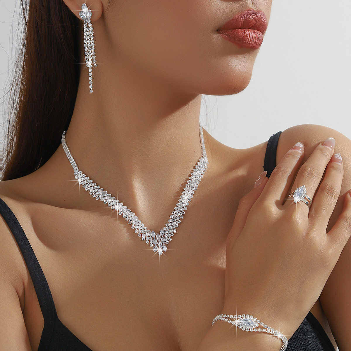 Cross-Border Fashion Hot-Selling Jewelry Full of Diamonds Simple Necklace Earrings Bracelet Four-Piece Wedding Dress Jewelry Set