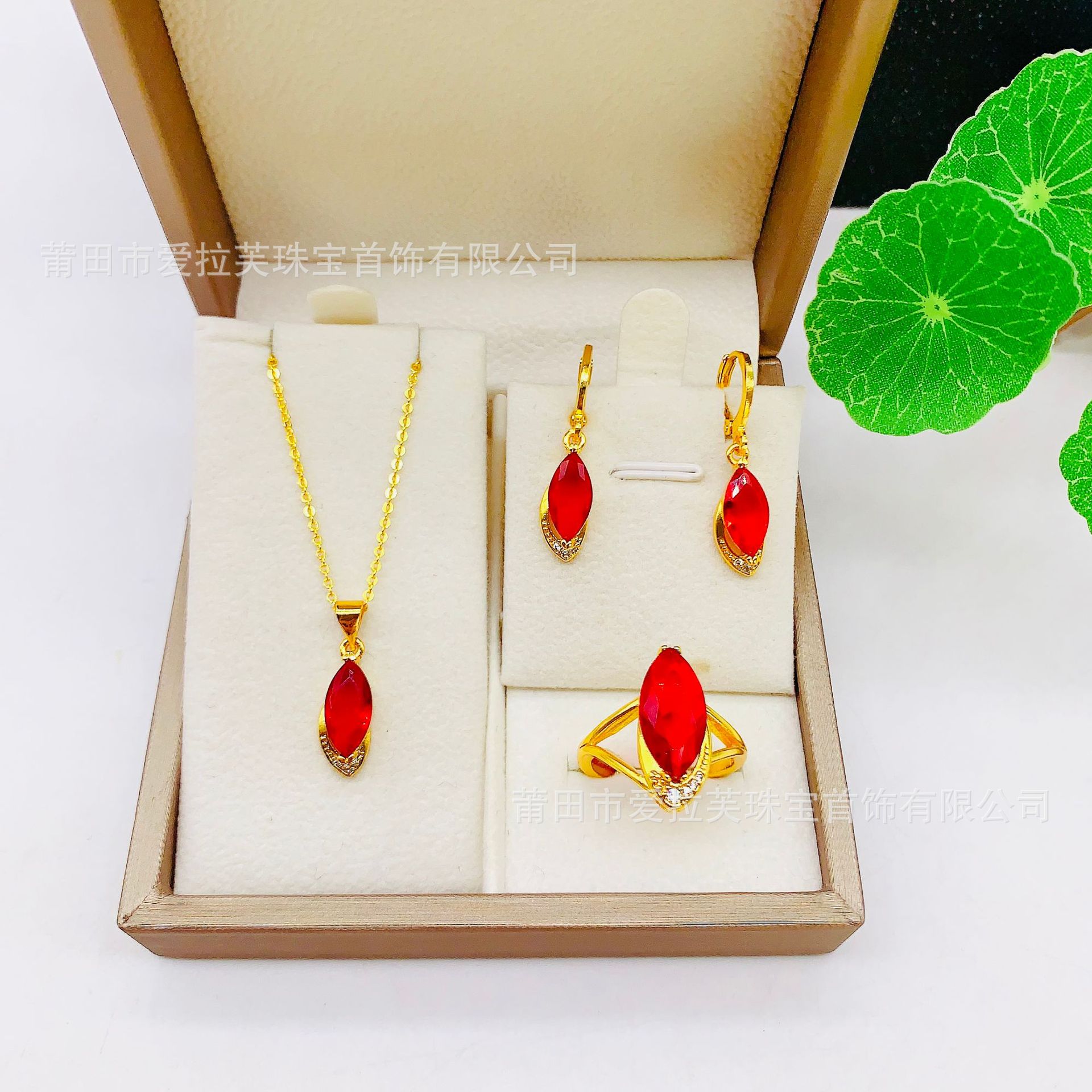 Authentic Fashion New Gold Plated Red Eye Water Drop Pendant Necklace Ring Earring Set Decorations Wholesale