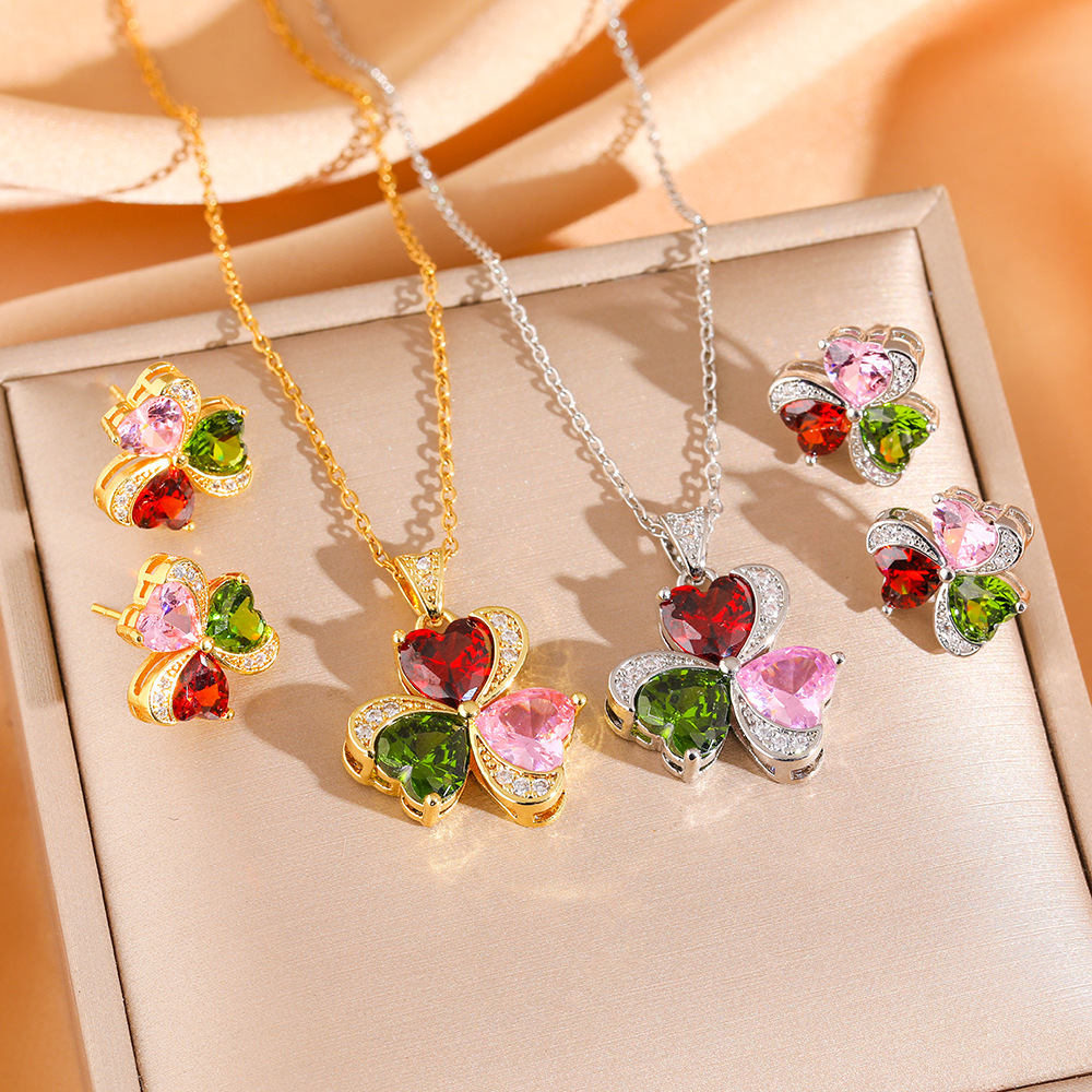 Titanium Steel Material, Colored Diamond and Zircon Three-Leaf Flower Necklace for Women, Non-Fading, Light Luxury, Full Zircon Earrings, Exquisite Jewelry Set