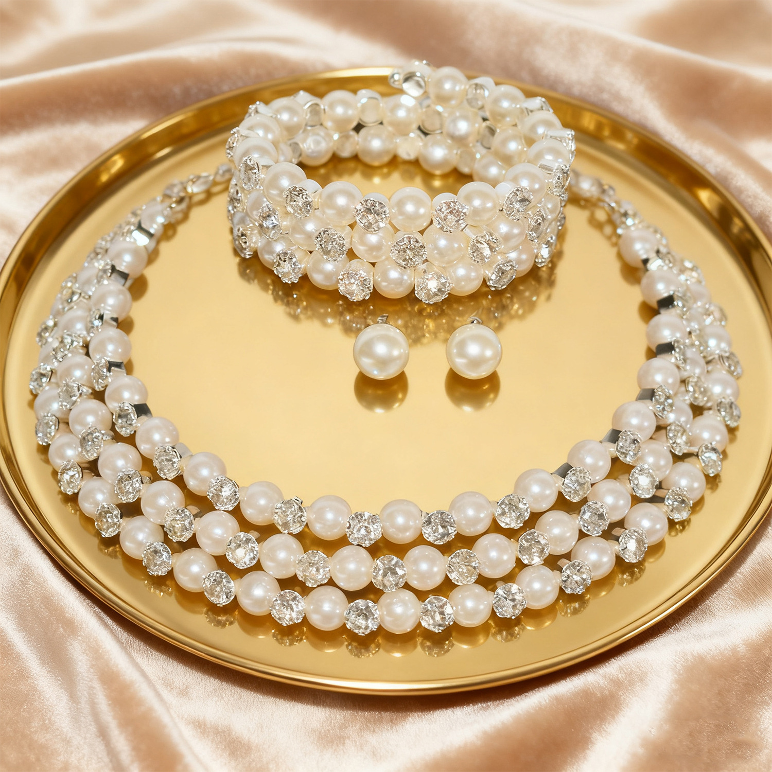 Cross-Border Bridal Wedding Luxury Style Fashionable Full Pearl Rhinestone Choker Bracelet Earrings Three Rows Three-Piece Set