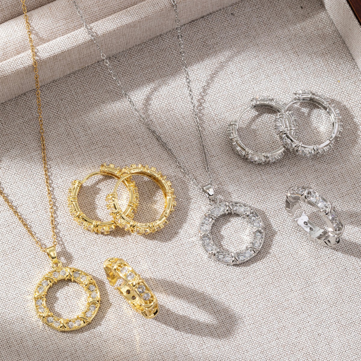 Trendy niche temperament geometric diamond necklace ring earrings suit high-end light luxury fashion ladies jewelry