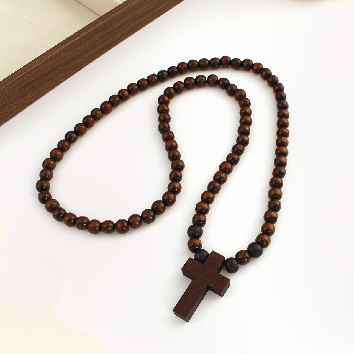 Amazon Hot Sale Classic Natural Wooden Beads Rosary Cross Pendant Necklace Handmade Men Bracelet suit