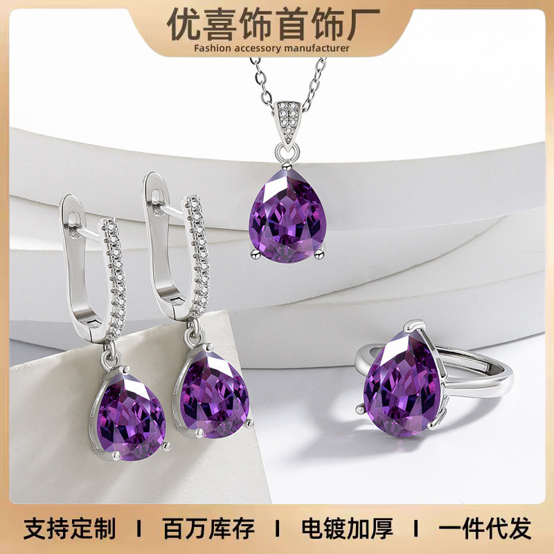 European and American Cross-Border Hot-Selling Amethyst Set Set of Simulated Jewelry Accessories Super Flash Water Drop Ring Necklace Earrings for Women