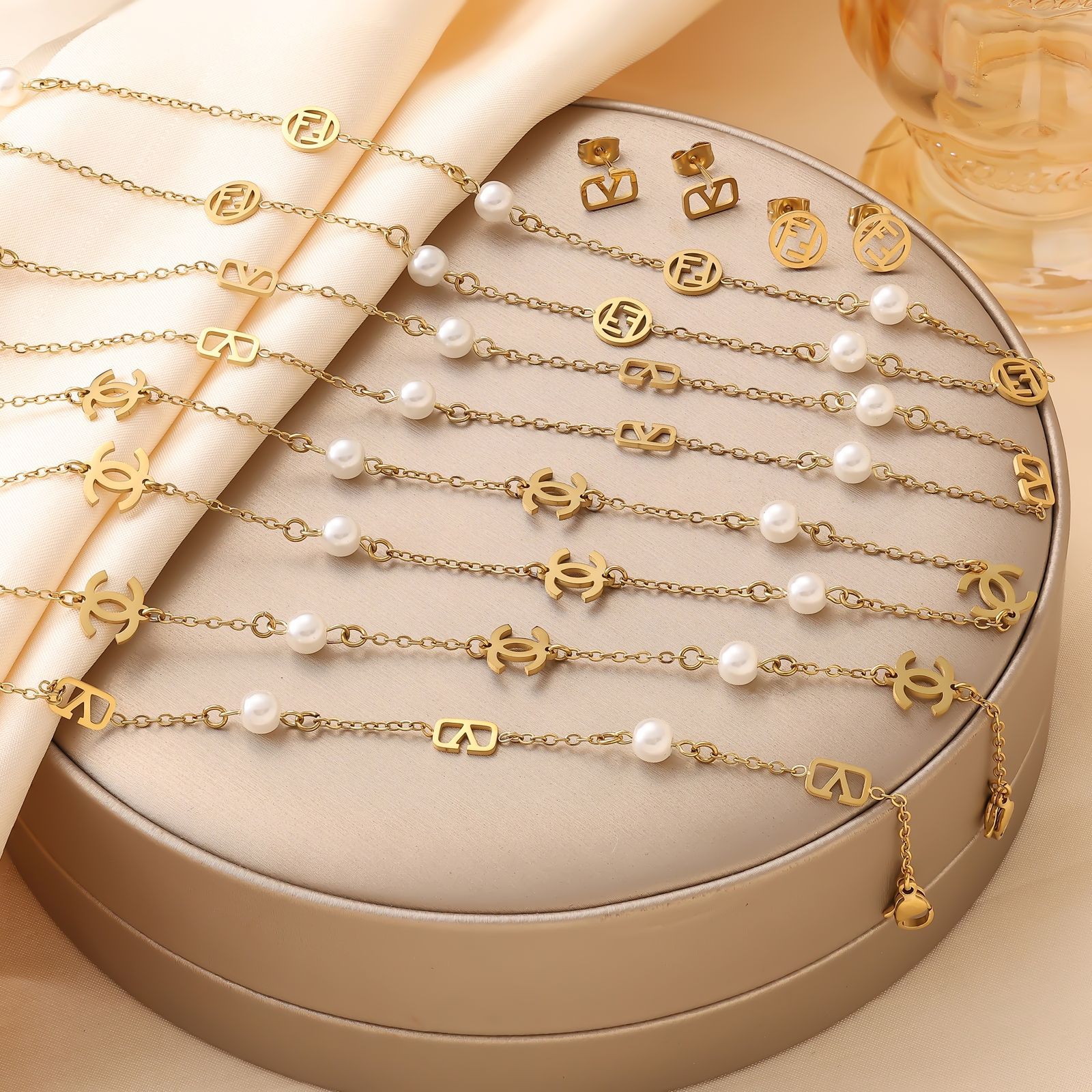 Xiangjia/Huajia Jewelry New Titanium Steel Necklace Set Casual Light Luxury Fashion V Letter Pearl Necklace Factory