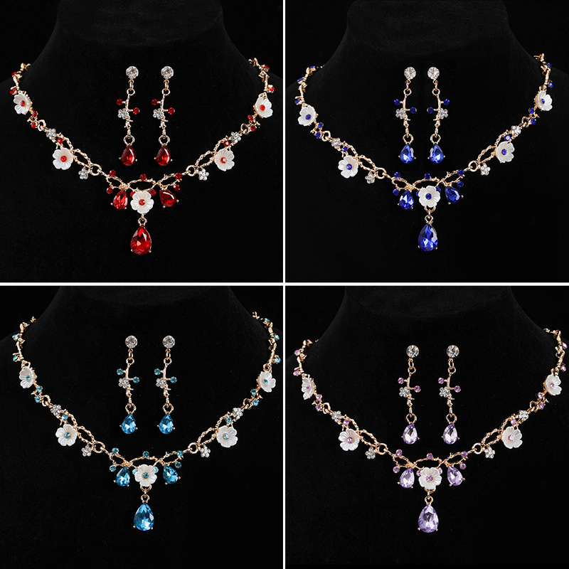 European and American fashion pink blue red rhinestone necklace earrings bracelet suit Amazon popular full diamond three-piece set