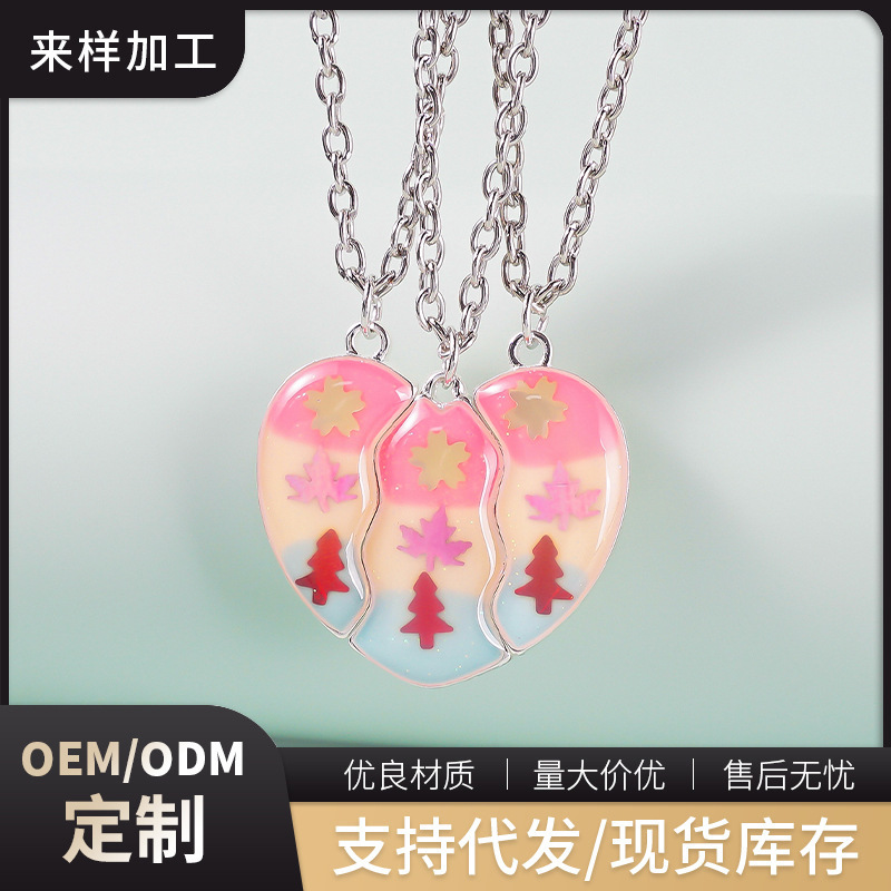 Simple Christmas Tree Maple Leaf Magnetic Three-Piece Pendant Necklace Cute Cartoon Heart Best Friend Student Gift Jewelry