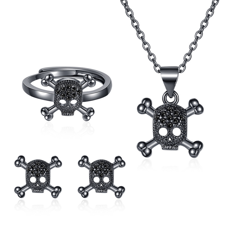 European and American New Arrival Full Diamond Skull Necklace Women's Halloween Vintage Punk Style Ins Earrings Ring suit Accessories