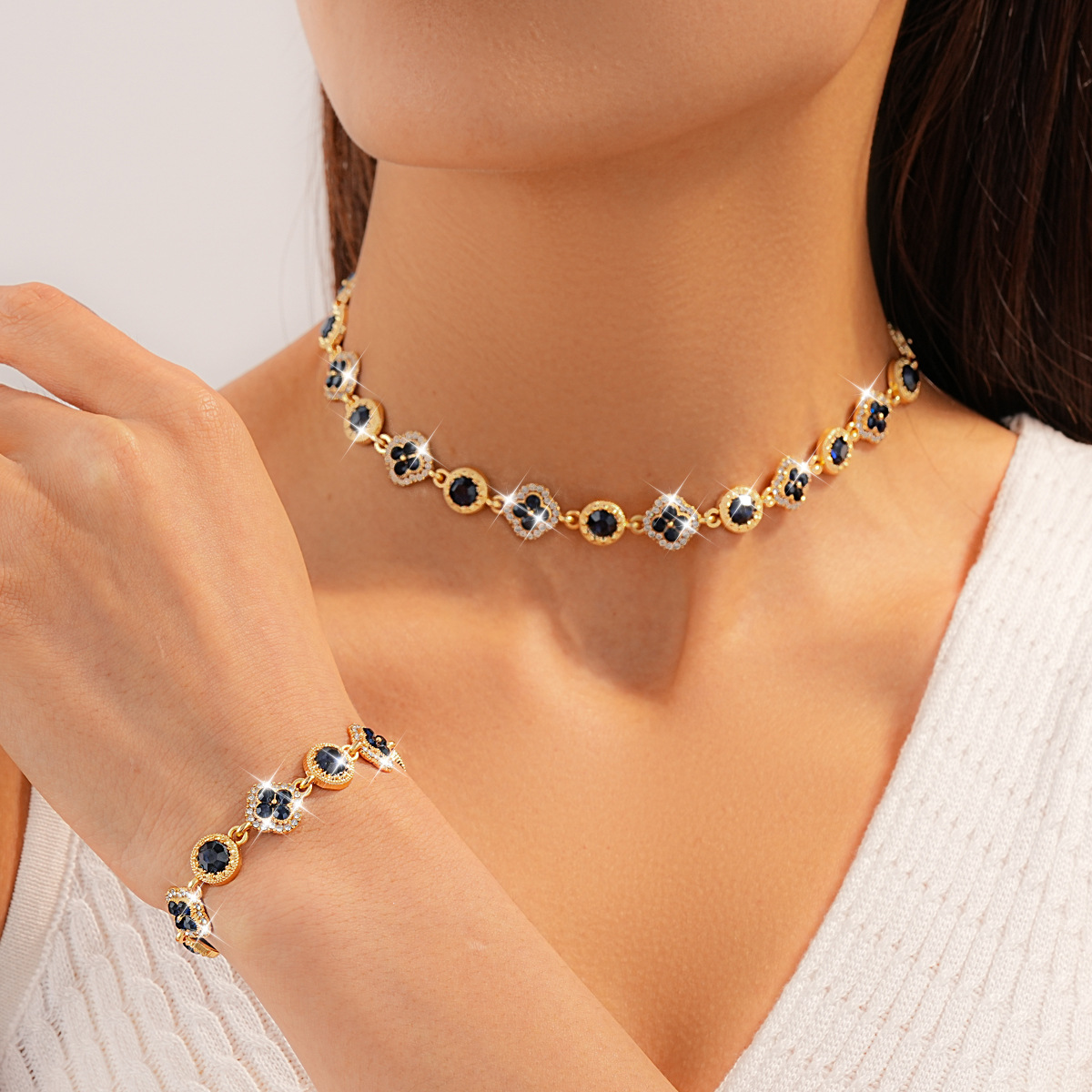 Diamond Flower Round Bracelet Necklace Set Retro Fashion Temperament Clavicle Chain Light Luxury High-End Necklace Wholesale