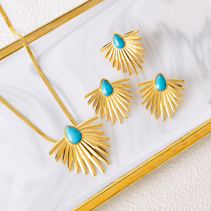 French blue turquoise water drop fan necklace light luxury high-grade pearl earrings fashion irregular open ring suit