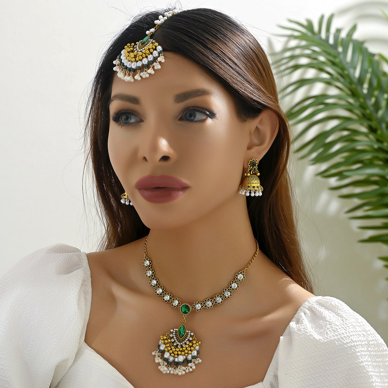 Fashionable Mid-East wind fan-shaped drop ear temperament head chain earrings necklace women's jewelry suit 1215
