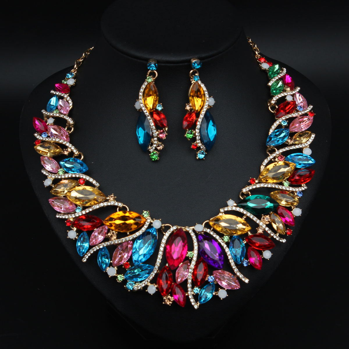 Cross-Border European and American Fashion Crystal Gemstone Necklace Women's Earrings Set Luxury Bridal Banquet Dress Accessories Wholesale