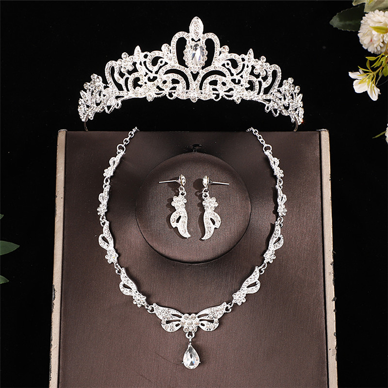 European and American Bridal Crown Tiara Necklace Earrings Rhinestone Three-Piece Set Main Wedding Dress Birthday Crown Retro Jewelry