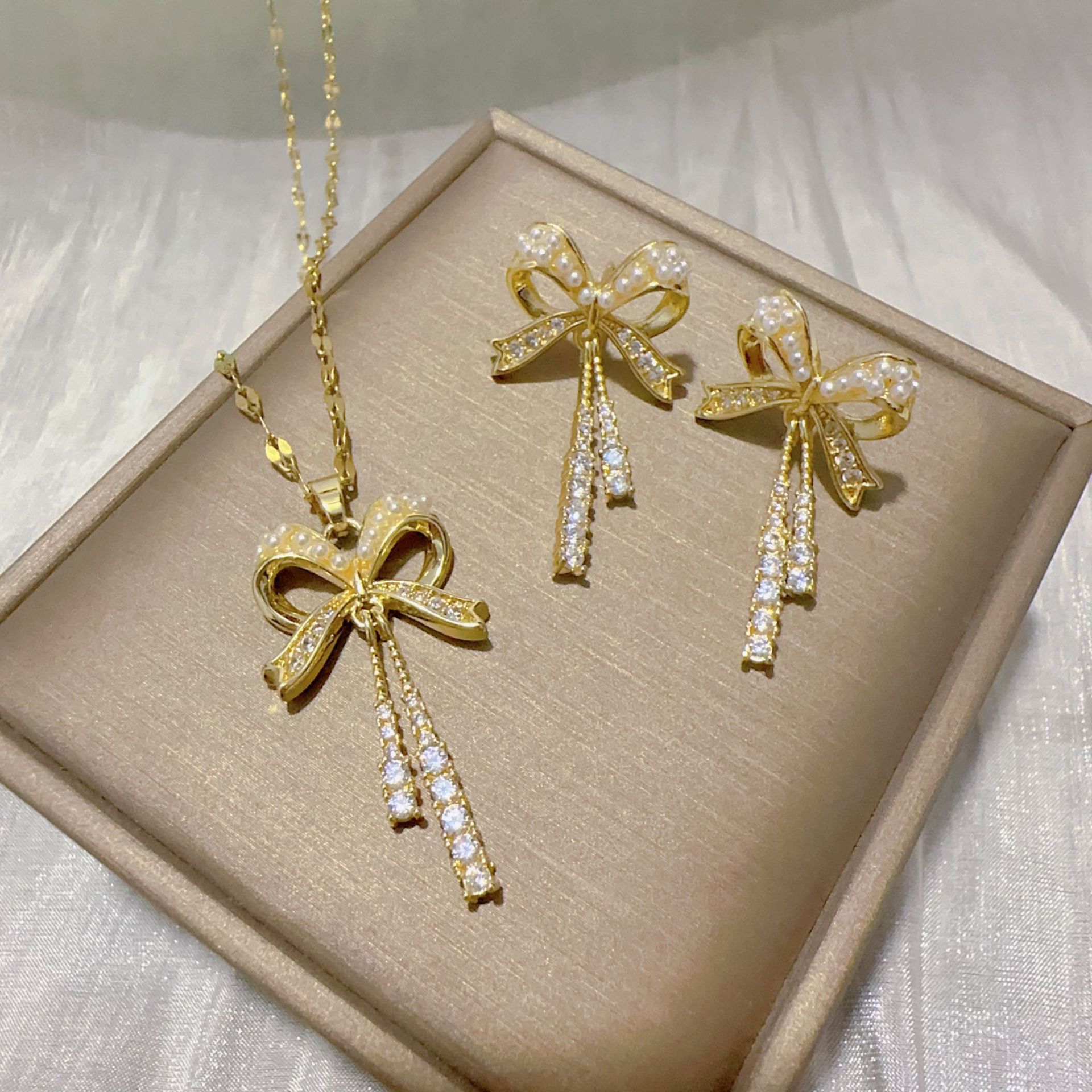 [Titanium Steel] Necklace and Earring Set Light Luxury Full Diamond Bow Tassel Personalized Temperament Banquet Earrings Necklace Set
