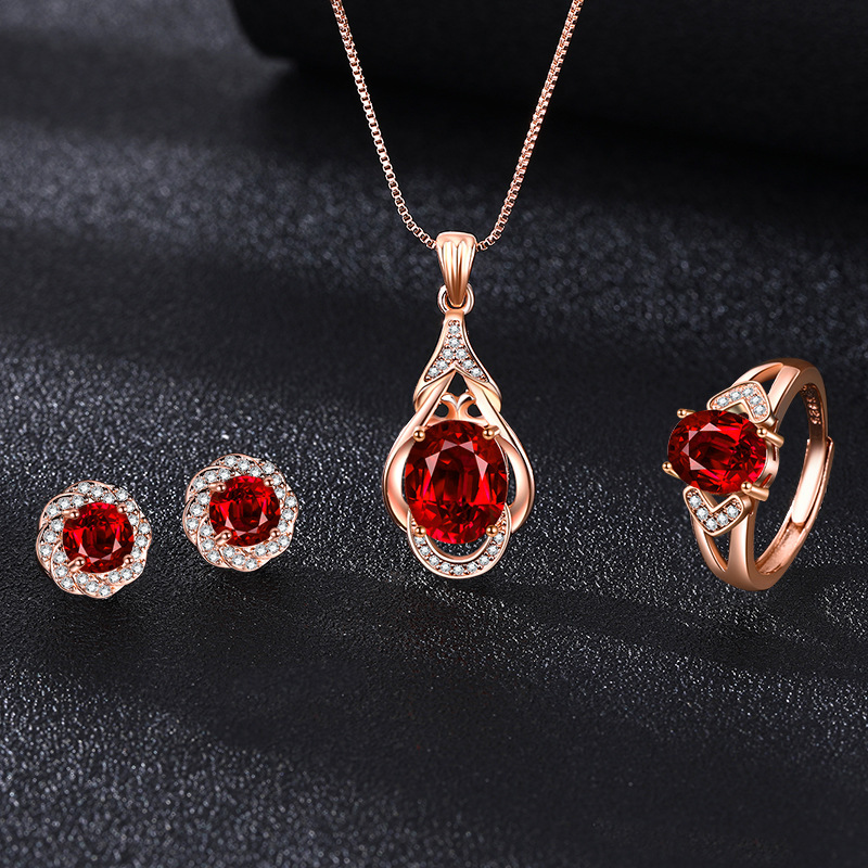 Live Hot Selling Ruby Diamond Jewelry suit Flower Design Ring Pigeon Red Blood Tourmaline Earrings Pendant Necklace