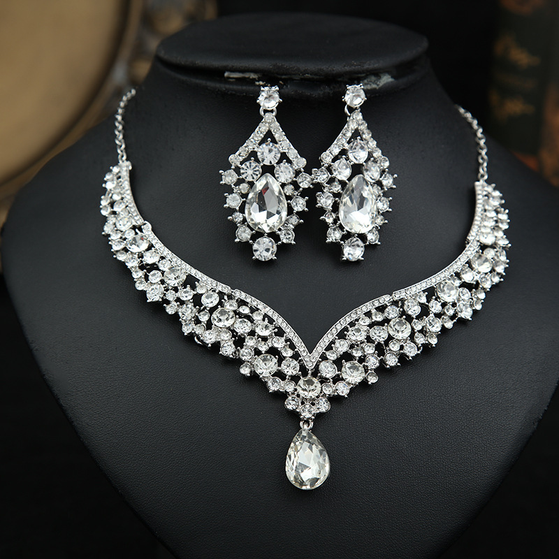 Hot European and American Exaggerated Bride Two-piece Necklace Earrings Alloy Full Diamond Exquisite Crystal Party Dress Accessories White