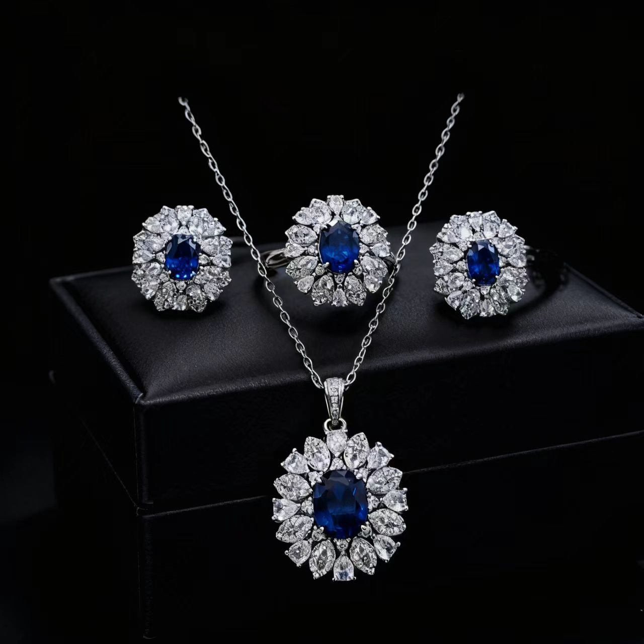 Fashion Full Diamond Colored Gemstone Three-Piece Jewelry Set Imitation Sapphire Sunflower Pendant Necklace Ring Earrings for Women Wholesale