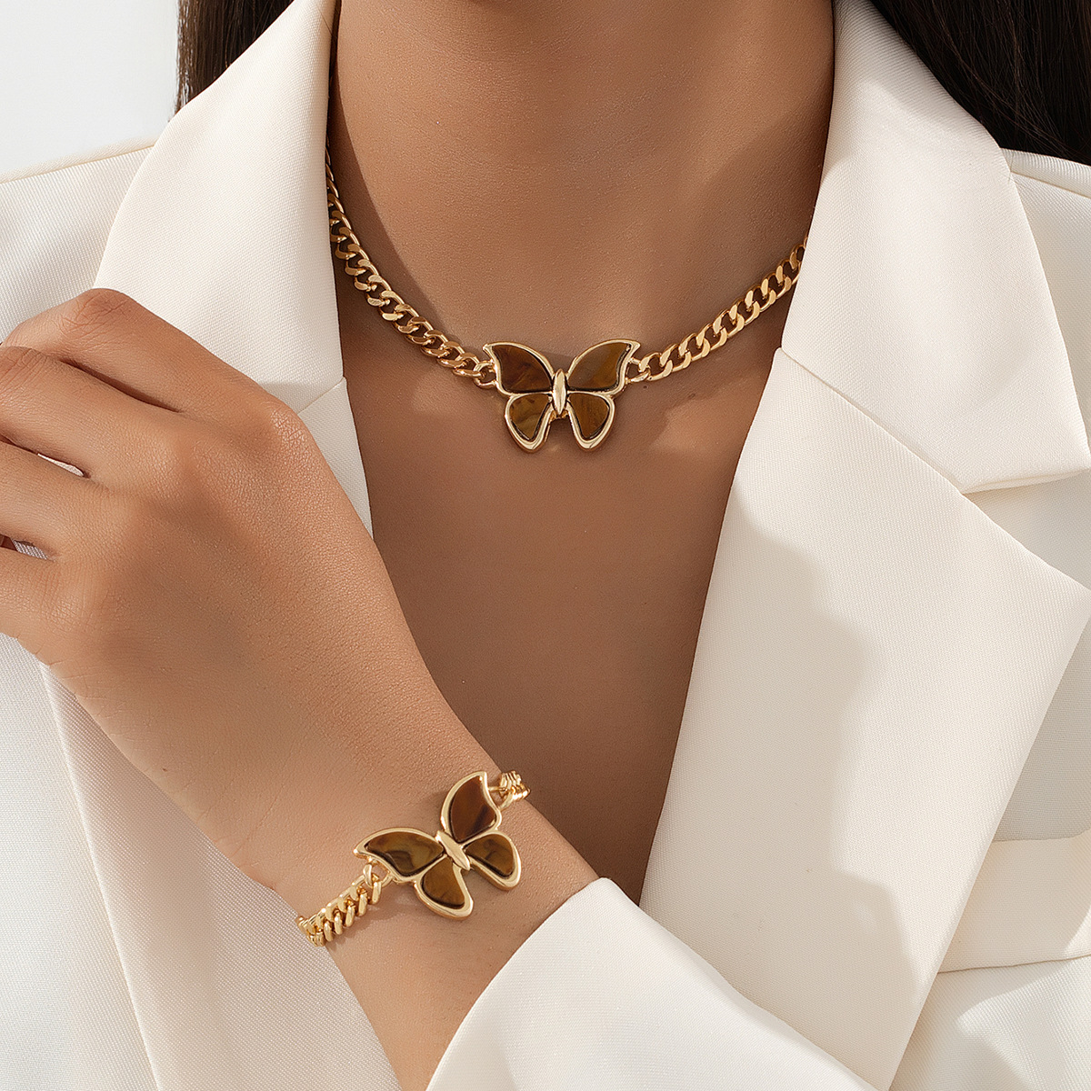 New fashion personality butterfly pendant necklace bracelet women European and American retro popular thick chain jewelry suit wholesale