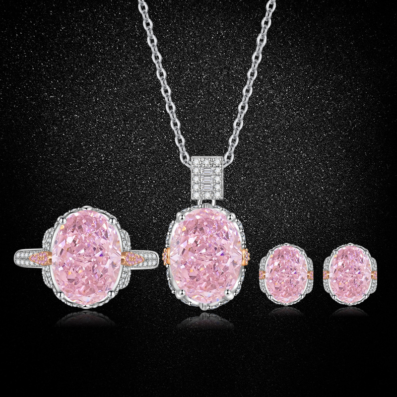 Tiktok Live Pigeon Egg High Carbon Diamond Ice Flower Cut Set Fashion Light Luxury Colored Gemstone Ring Earrings Necklace Three-Piece Set