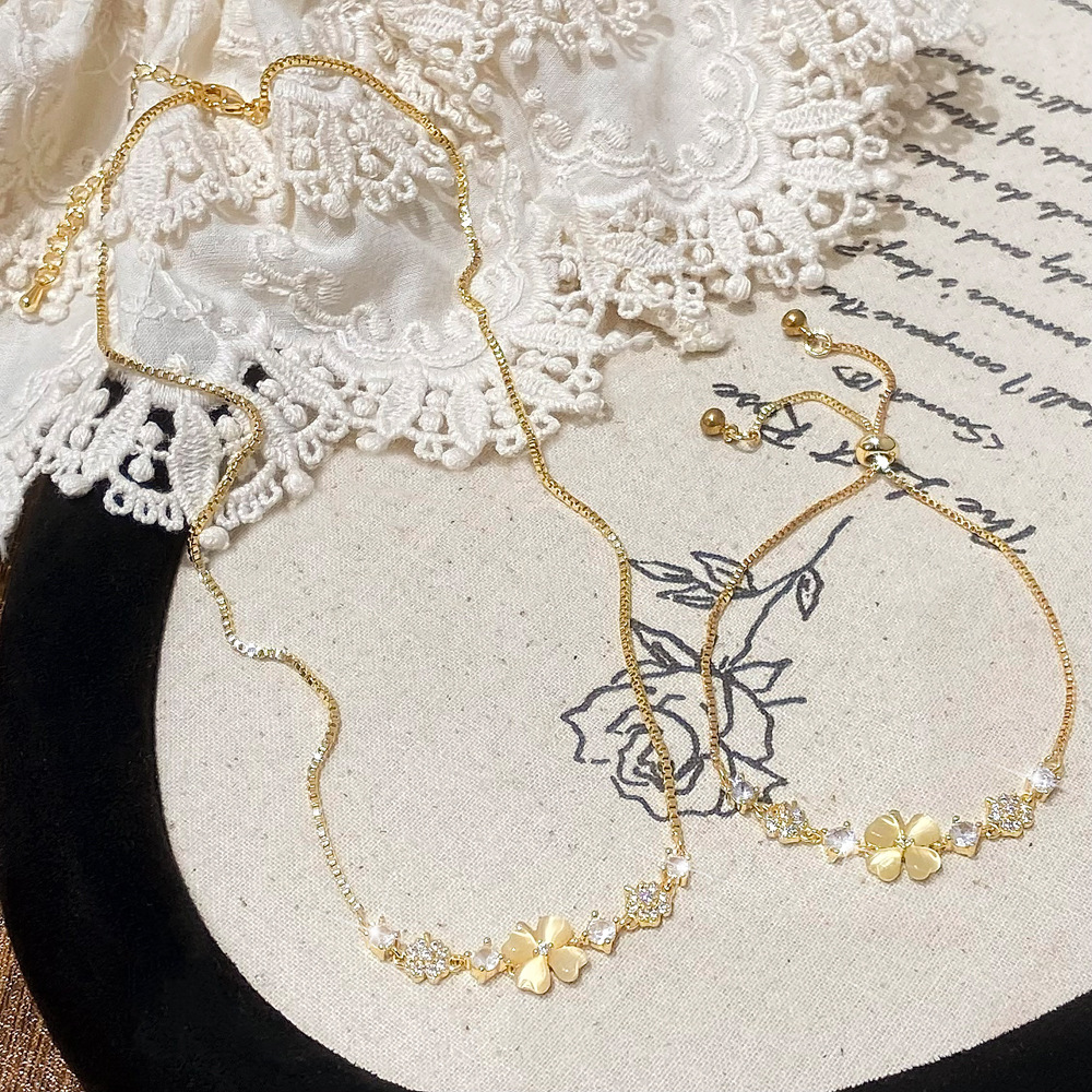 Bracelet Trendy All-match Light Luxury Niche Design Sense Four-leaf Flower Cat's Eye Stone Shaft Pull Adjusting Bracelet Necklace suit