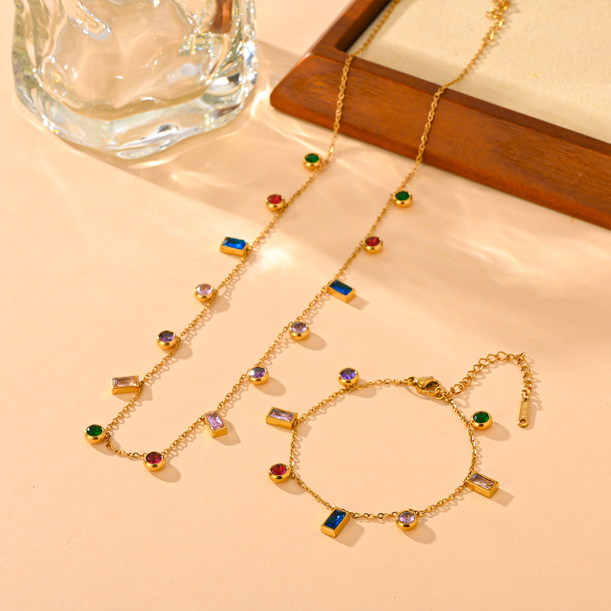 Cross-border titanium steel colorful zircon necklace bracelet suit elegant fashion temperament Joker necklace suit