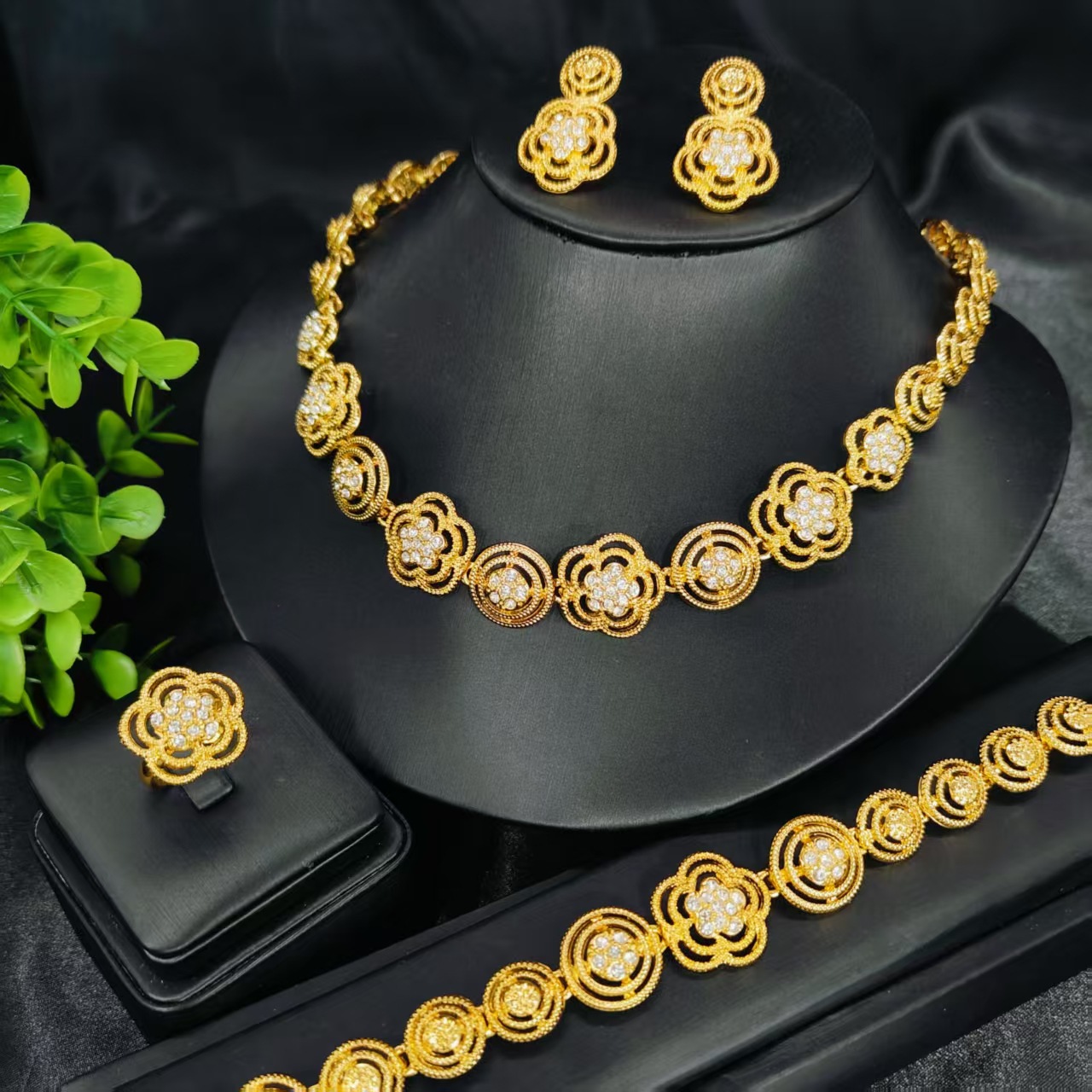 Cross-Border Hot-Selling Zircon Gold-Plated Necklace, Earrings, Bracelet, and Ring Four-Piece Set, European, American, and African Bridal Wedding Jewelry