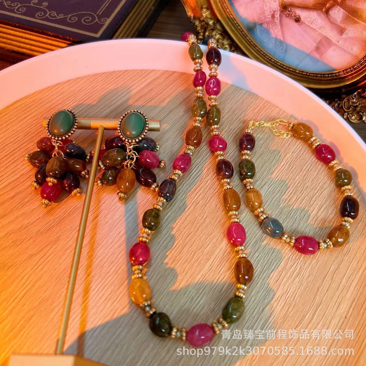 Vintage Tourmaline Agate Western Colorful Duobao suit Necklace Ancient vintage National Style Stone Bracelet Earrings