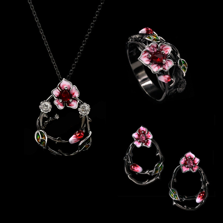 European and American Gothic Style Black Gold-Plated Two-Color Dark Rose Ring Necklace Earrings Fashionable Enamel Three-Piece Jewelry Set