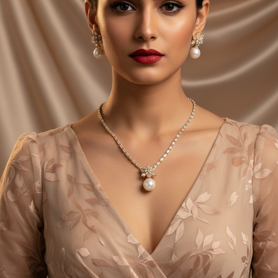 Japanese and Korean high-end pearl zircon snowflake necklace earrings suit Korean-style socialite temperament cold style fashion jewelry