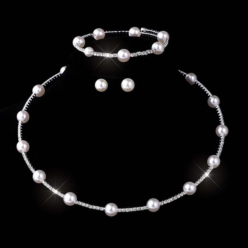 Foreign Trade Cross-border Pearl Rhinestone Necklace Bracelet Earrings Set Bride's Full Diamond Neck Chain All-match Clavicle Chain Jewelry