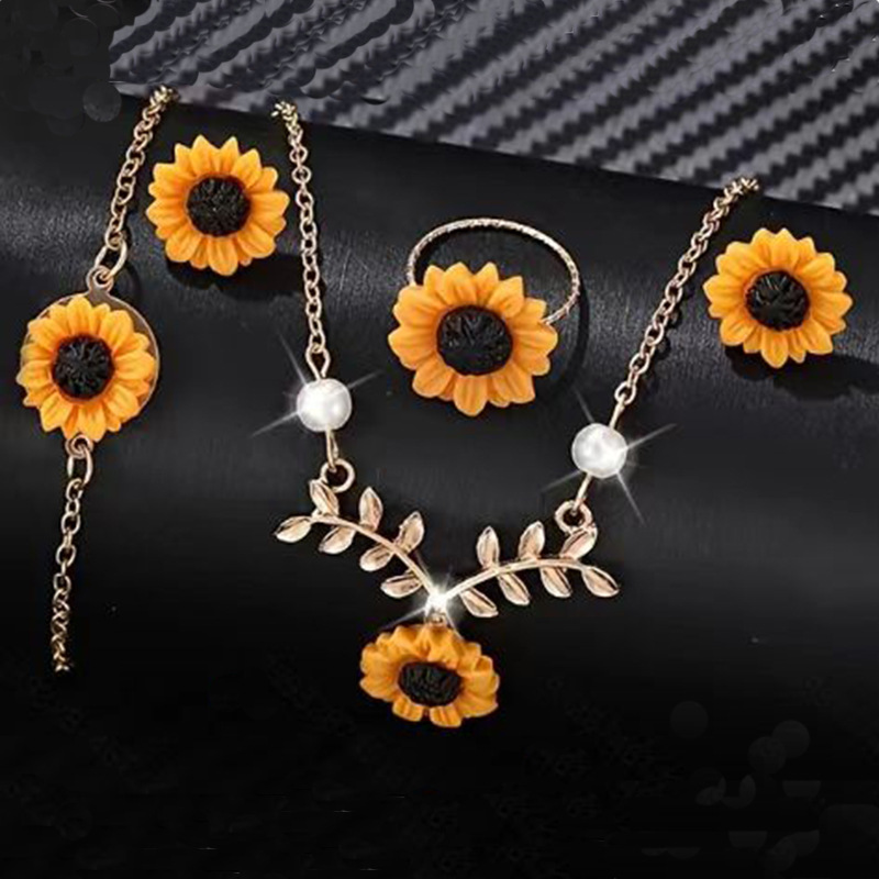 European and American Jewelry Hot Selling Creative Sunflower Necklace Sunflower Earrings Ring Flower Bracelet Alloy Four-Piece Set