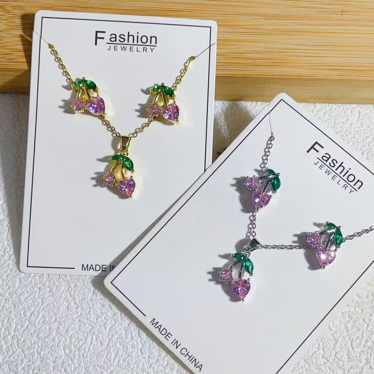 Cherry Pendant Necklace Purple Water Drops Set Zircon Cherry Necklace Earrings Jewelry suit All-match Fashion Necklace Women
