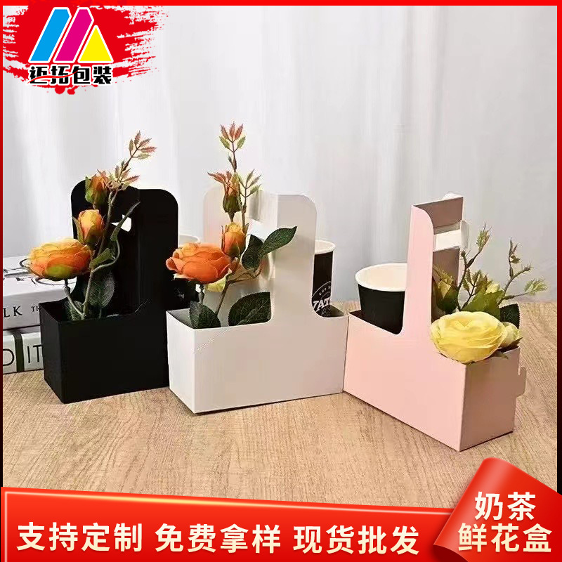 Portable Milk Tea Cup Holder Disposable Thickeneded White Cardboard Printed Takeaway Packaging Ready-Made Flower Kraft Paper Box