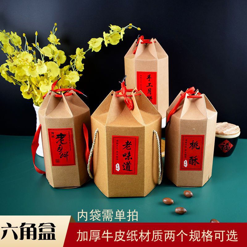 Hexagonal Kraft Paper Box Thickeneded Cow Cardboard Box Empty Box Satchel Retro Traditional Old-Fashioned Mooncake Peach Cake Box 10 Pieces
