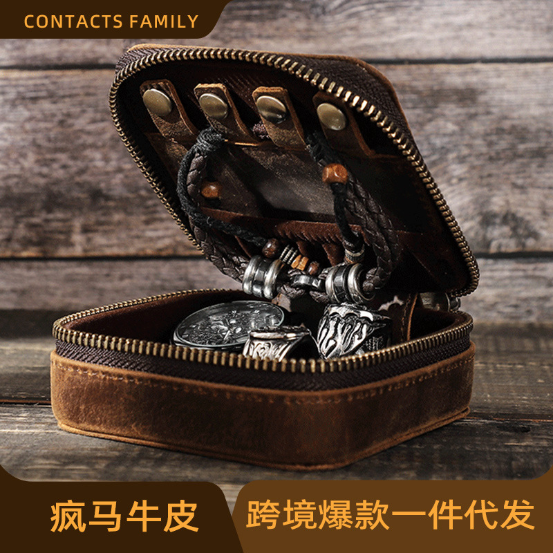 CONTACTS FAMILY Vintage Crazy Horse Cowhide Watch Storage Box Single Pack Convenience Zipper Watch Case
