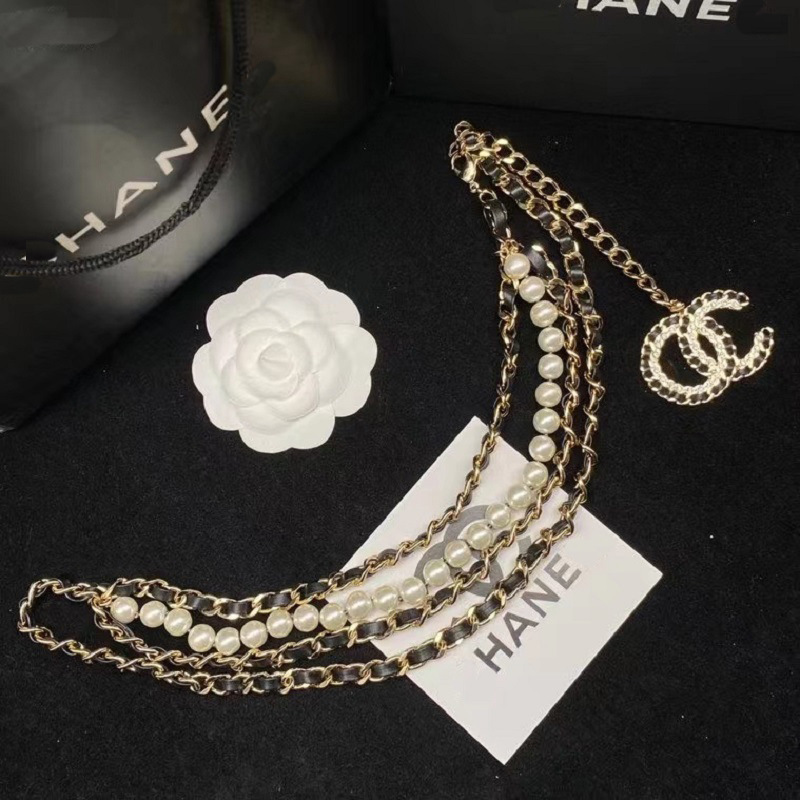 European and American brass multi-layer twisted chain Chanel style black sheepskin Pearl waist chain double C rhinestone belt