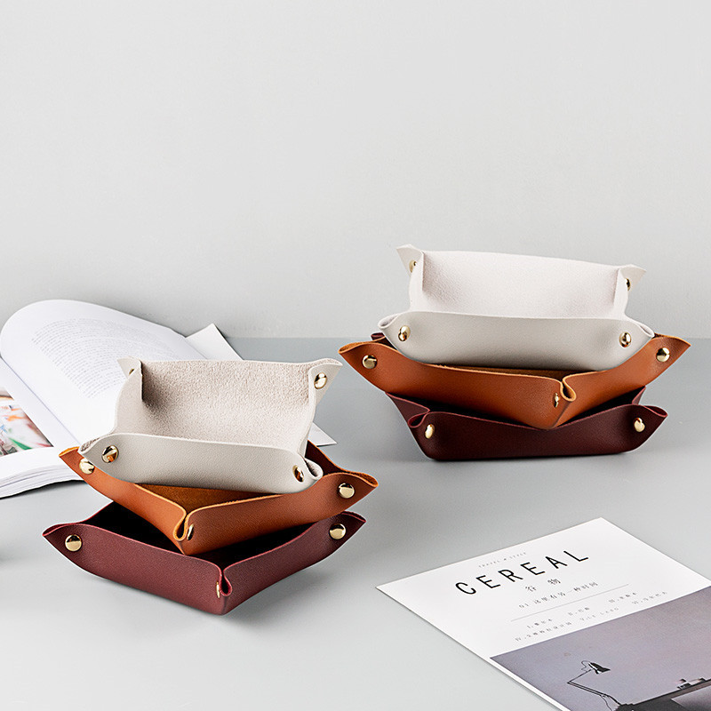 Leather Desktop Storage Tray Cowhide Folding Sundries Storage Tray Four-Corner Folding Storage Box Homestay Desktop Storage