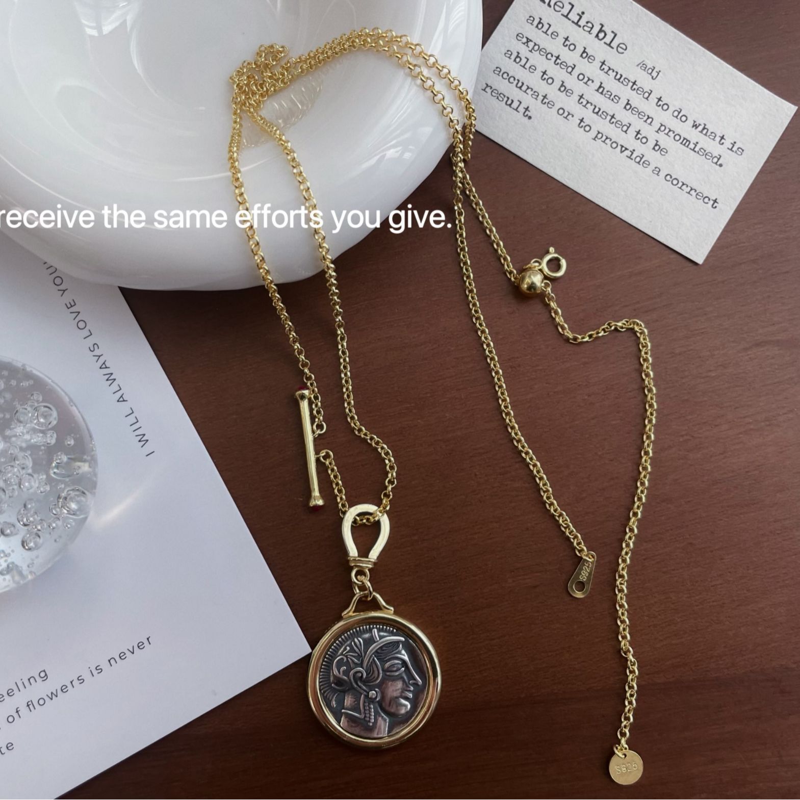 S925 Sterling Silver Gold-Plated Greek Athena Goddess Necklace Ancient Coin Relief Double-Sided Pull-Out Adjustable Long Style