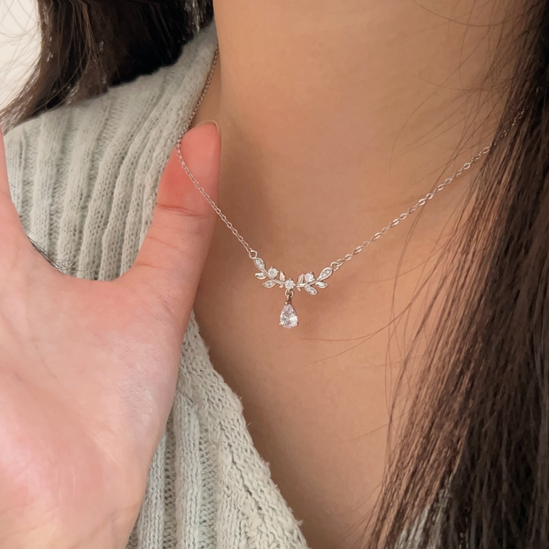 Under Banyan Tree S925 Silver Light Luxury Niche Wheat Ear Zircon Flower Branches Water Drop Necklace Female High Sense Goddess Clavicle Chain New