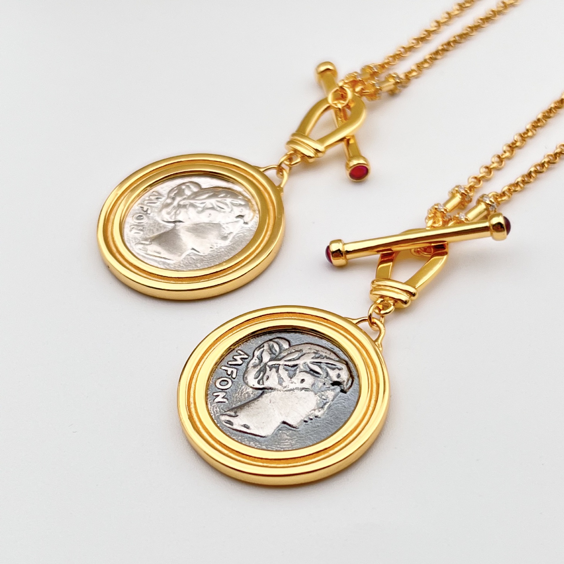 Victory Goddess double-sided ancient coin light Jewelry pendant 925 silver plated 22K gold premium coin sweater chain necklace
