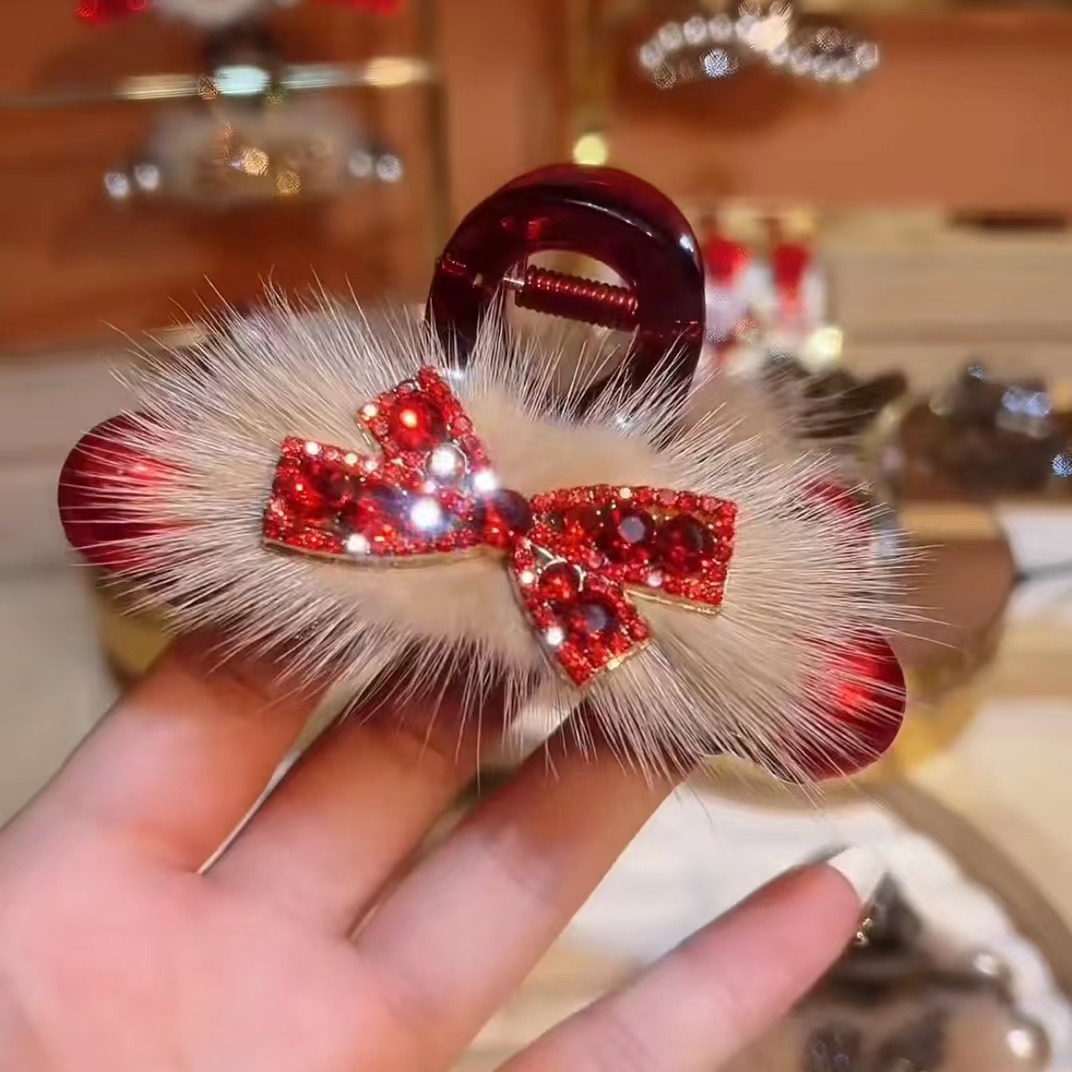 Red festive bow furry clip elegant light luxury fashion hair accessories double-sided exquisite goddess Korean style shark clip