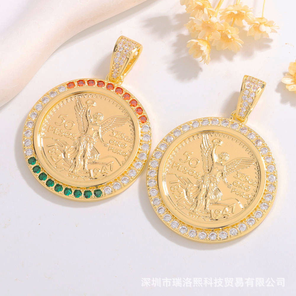 Mexican Liberty Angel 50 Peso Gold Coin Micro-Inlaid Zircon Personality Hip-Hop Necklace Pendant Personalized Pendant
