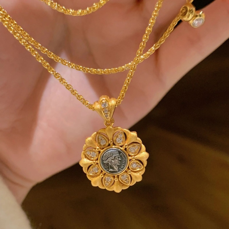 Vintage vintage lucky goddess brushed sunflower ancient coin necklace personalized fashion micro inlaid zircon clavicle chain