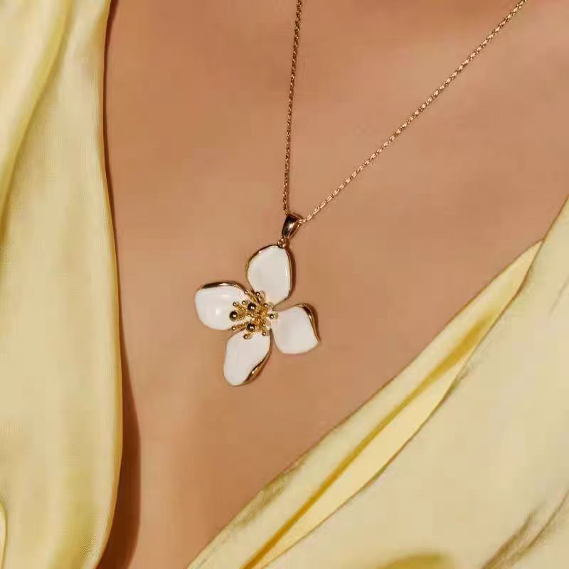 Goddess Gift Italian Retro Jewelry White Four-Leaf Petal Flower Necklace Earring Set Light Luxury Personality Trend