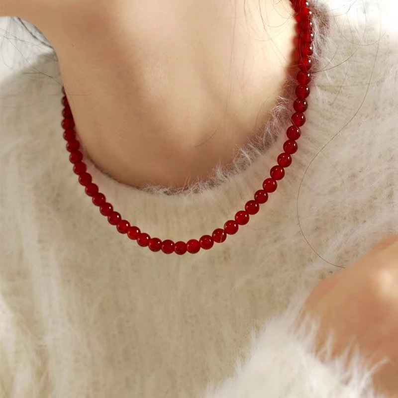 French Retro Red Agate Green Agate Chalcedony Beaded Necklace for Women with Ingot Clasp Collarbone Chain Goddess' Day Jewelry