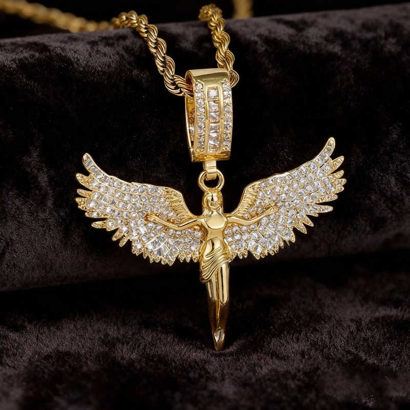 Cross-Border Tk Full Diamond Angel Goddess Spread Wings Pendant Necklace High-End Personalized Hip-Hop Clavicle Chain Jewelry Wholesale