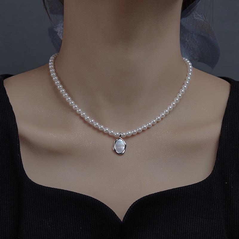 S925 Sterling Silver Pearl Necklace for Women, Simple and Elegant White Shell Light Luxury Pendant Sweater Chain, Gift for Girlfriend