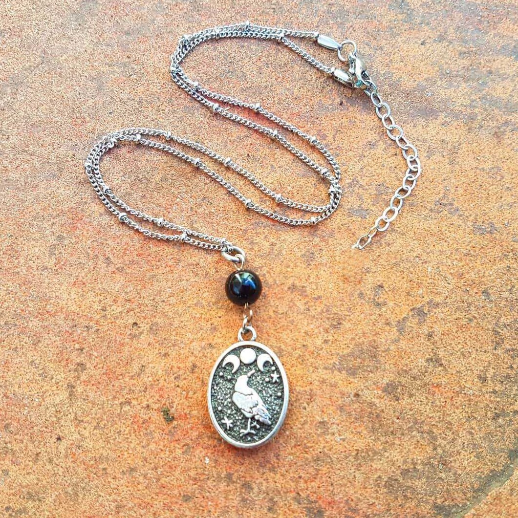 Gothic Triple Moon Crow Goddess Oval Pagan Witchcraft Mystical Crow Vintage Necklace Evil