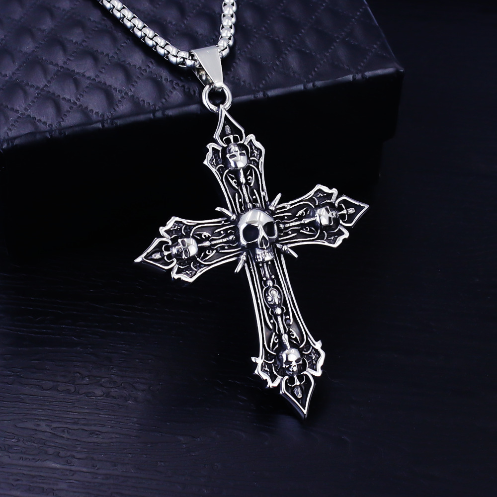 2026 European and American Jewelry Titanium Steel Cross-Shaped Pendant Personalized Punk Retro Trendy Male Skull Stainless Steel Necklace