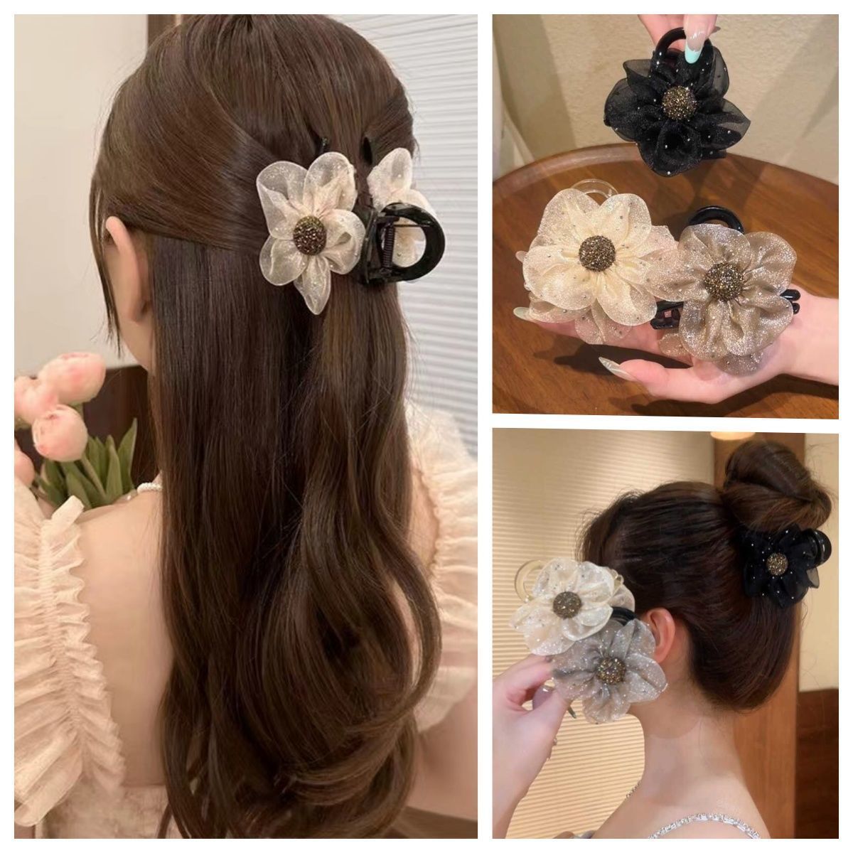 Goddess Flower Medium Clip Organza Elegant Temperament Casual Rhinestone Hair Clip Women's 2024 New High Ponytail Clip
