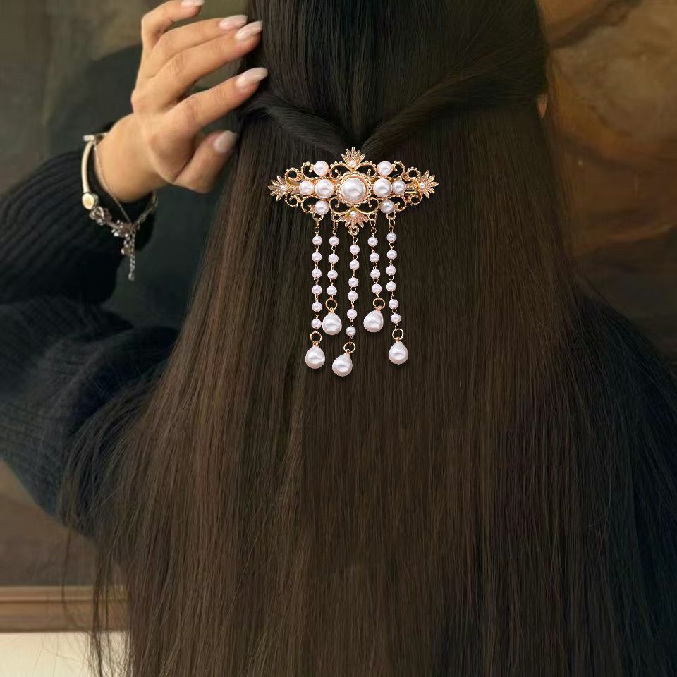 Vintage Palace-Style Pearl Tassel Small Spring Clip Top Clip Light Luxury Goddess Hairpin Horizontal Clip Side Clip Gift